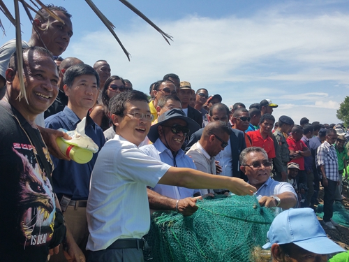 随后,中东领导还参与了虱目鱼苗投放仪式,五千虱目鱼苗被投放至新池,AG真人海水养殖基地多元化搭配养殖模式正式开启。在中方先进的养殖技术帮助下,相信洛钰森海水养殖场将会在不久的将来在东帝汶海产品市场注入一股洪流带动东帝汶本地养殖户走上发展科学海产养殖之路,而今天的收获与放苗仪式仅仅是第一步。