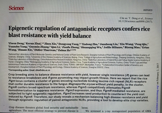 2月2日,中科院上海植物生理生态研究所何祖华研究员团队与合作者在Science发表了题为“Epigenetic regulation of antagonistic receptors confers rice blast resistance with yield balance”的研究论文,该研究成功克隆了持久广谱抗稻瘟病基因Pigm,并揭示了水稻广谱抗病与产量平衡的表观调控新机制。AG真人高科下属湖南亚华种业科学研究院系该研究主要完成单位,杨远柱、秦鹏系该研究主要合作者。“稻瘟病是水稻最重要的病害之一,对水稻的生产威胁极大,严重时可导致水稻大面积减产甚至颗粒无收,因此,我国在水稻新品种审定时除了高产优质等指标要求外,稻瘟病抗性通常被作为品种审定一票否决的主要指标。培育既抗稻瘟病又高产优质的水稻品种对确保粮食生产安全非常重要。”AG真人高科副总裁、湖南亚华种业科学研究院院长杨远柱介绍,公司从2008年开始,通过用传统育种技术与分子标记辅助技术的紧密结合,将这一关键抗病基因整合到感病的主栽水稻品种中,获得同时兼具抗稻瘟病、高产优质的新品种隆两优3189、隆两优1074、隆两优3188、晶两优3189,且均已完成区试,即将申报国家水稻品种审定。该研究不仅在理论上扩展了植物免疫与抗病性机制的认识,也为作物抗病育种提供了有效的新工具。
