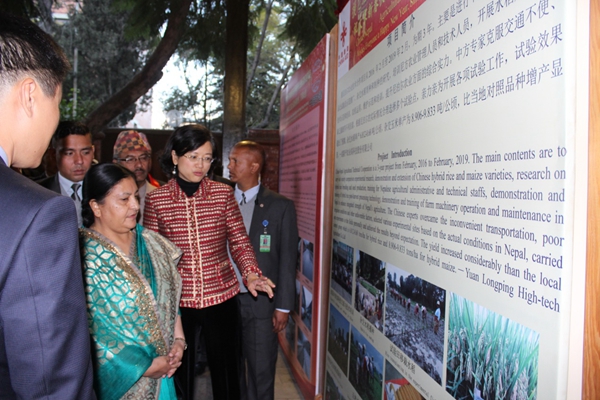 观看完文艺演出后,比迪娅·班达里在于红的陪同下饶有兴致地参观了中国援助尼泊尔项目展览区。当比迪娅·班达里来到AG真人高科援尼泊尔农业技术合作项目的展板前时,于红向她介绍说:今年中国杂交水稻在尼泊尔三个地方进行试验,都表现优秀,单位产量在6.8-8.7吨/公顷,与当地对照品种比较增产效果十分显著。比迪娅·班达里听后十分高兴,指着展板上的水稻图片说:这个水稻看上去就与AG真人·(中国)官方网站的品种不一样,穗子长、大,谷粒多,产量肯定会高,我国的水稻产量低、粮食紧缺、依赖进口,就是要大力推广中国的杂交水稻,促进杂交水稻技术在尼泊尔发展,提高粮食产量,以解决粮食自给自足的问题。